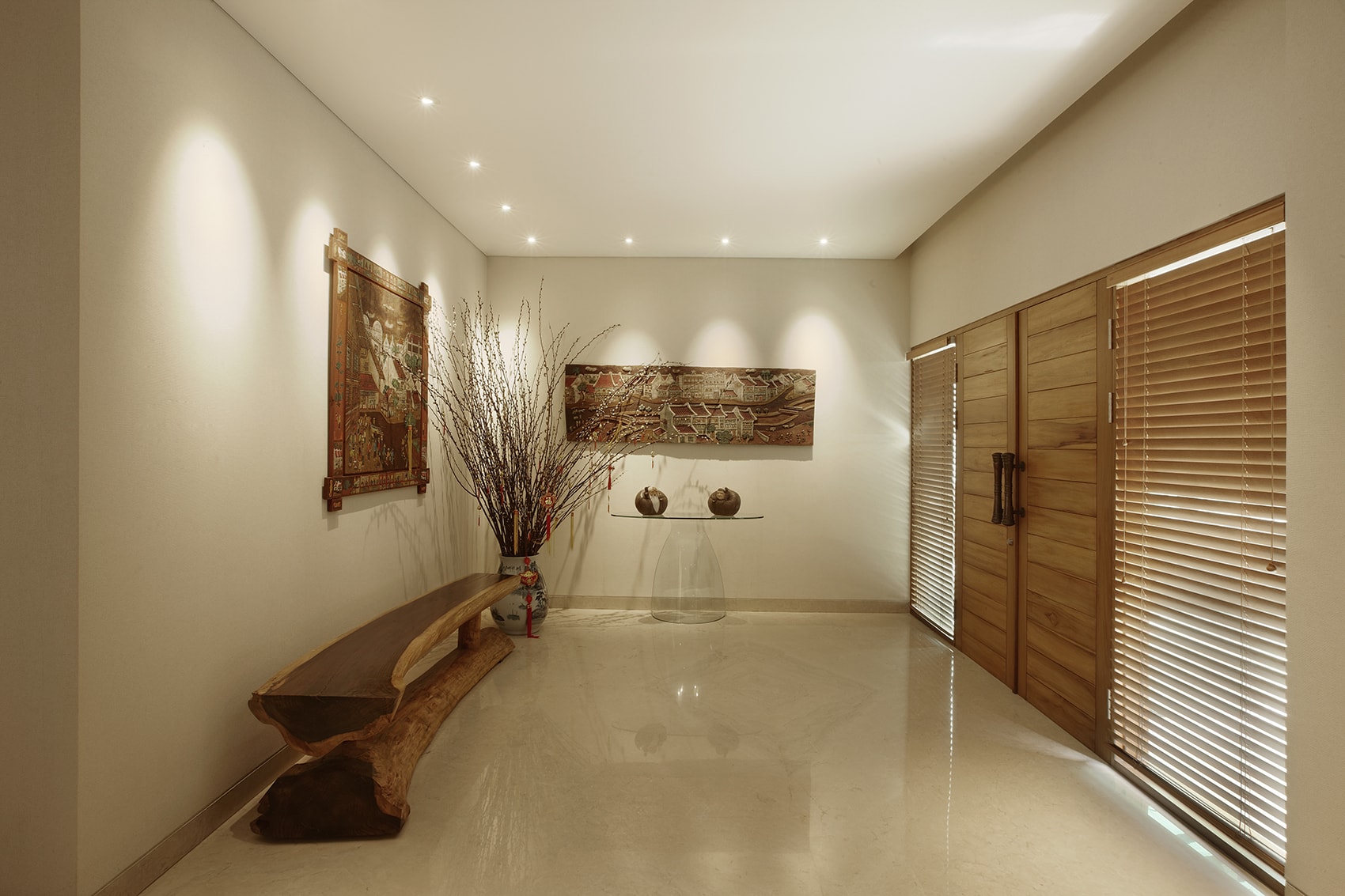 This is a house interior and architecture renovation project in Old Town Jakarta area. Originally, the house was two old townhouses combined into one. The interior design pallete is a calm pastel and cream color from various materials. Cream colored marble flooring becomes the main material of which all the other surface colors follow. We use all LED spot lighting to and repurpose existing rooms into a large space as an exercise in sustainable design.